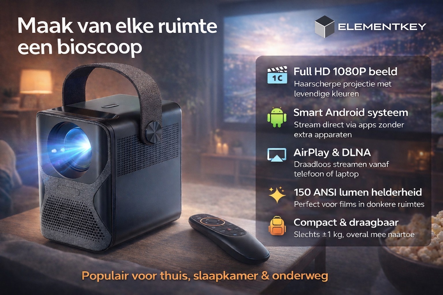 Elementkey BEAM LITE + Muis – WiFi Full HD Projector - 1080P Cinema – Android Beamer – 3300 Lumen - Airplay / DLNA - Zwart