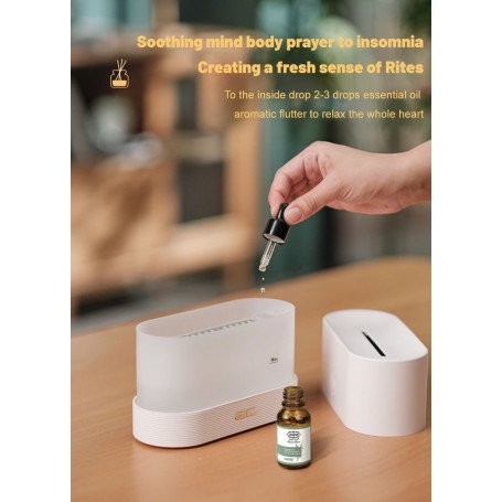 Ingebouwde ventilator: Door middel van de ingebouwde krachtige ventilator wordt het bevochtigde lucht met eventuele lekkere geur goed verspreid over de hele kamer. Dit zorgt voor een mooie rustgevende effect en zorgt ook voor een goede verspreiding.