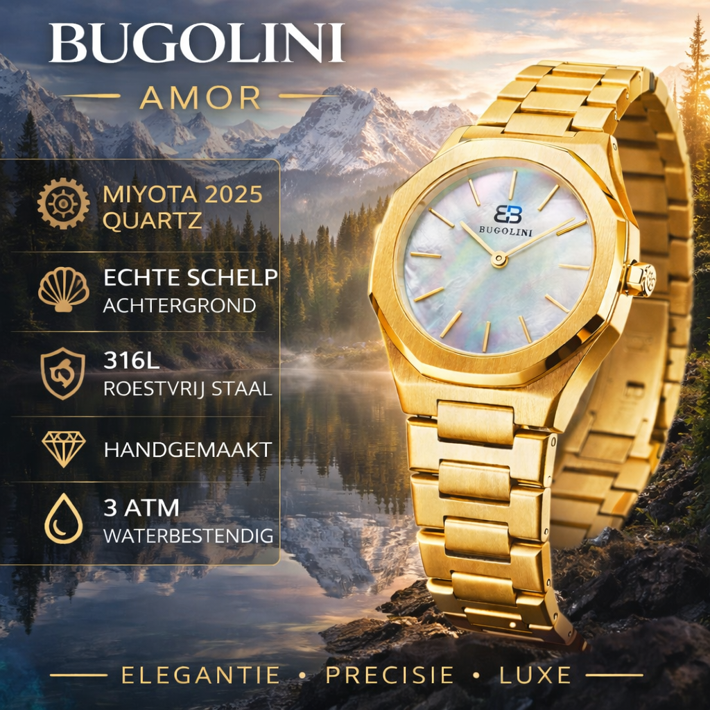 BUGOLINI AMOR Steel - 36mm MIYOTA 2025 QUARTZ Horloge voor Dames - Echte Schelpen Wijzerplaat - Vrouwen Horloge - Goud