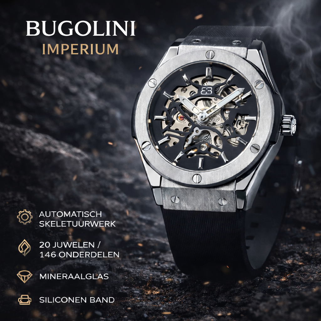 Versterk uw uitstraling met de BUGOLINI® IMPERIUM, een krachtig mechanisch meesterwerk dat traditie en technologie combineert. Dit opvallende uurwerk heeft een volledig automatisch skeletuurwerk met 20 juwelen en maar liefst 146 bewegende onderdelen, die harmonieus samenwerken om een nauwkeurige, vloeiende tijdmeting te leveren – volledig zonder batterij.