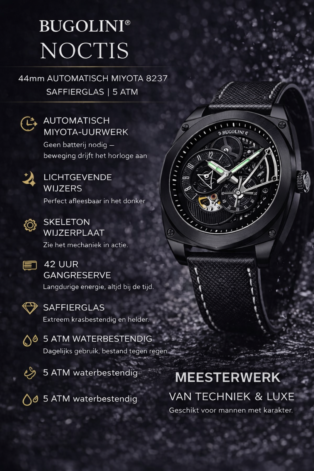 BUGOLINI NOCTIS – 49mm Stalen Automatische Horloge – Mechanisch MIYOTA-uurwerk– Lichtgevend - Waterdicht - Zwart